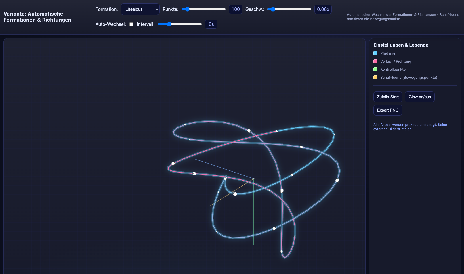 Während der Ferien habe ich die Gelegenheit genutzt, einer kleinen Schafsherde von sechs Tieren über einen längeren Zeitraum beim Grasen zuzusehen. Die Tiere zeigten eine bemerkenswerte Fähigkeit, die Schafswiese in einer Weise zu beweiden, die einer perfekten Abgrenzung gleichkam. Es entsteht der Eindruck, dass sie sich vorbestimmten Mustern und Pfaden folgend bewegen. Ihre Mobilität ist durch die Bildung von Gruppen und die Einnahme unterschiedlicher Formationen charakterisiert. Die Tiere zeigen ein wiederkehrendes Verhalten, das sich durch die Nahrungsaufnahme, Wiederkeuen, Rückkehr und Schlafphasen auszeichnet. Die beobachteten »Muster« (für Pfade, Formationen/Gruppen) wurden mittels einer KI erstellten Animation veranschaulicht.